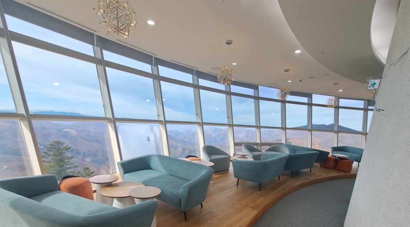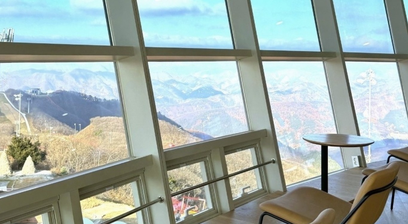 관광 곤돌라를 타고 정상에 오르면 설원이 펼쳐집니다. 스키를 타지 않아도 전망 카페에서 여유로운 겨울 풍경을 즐길 수 있습니다.