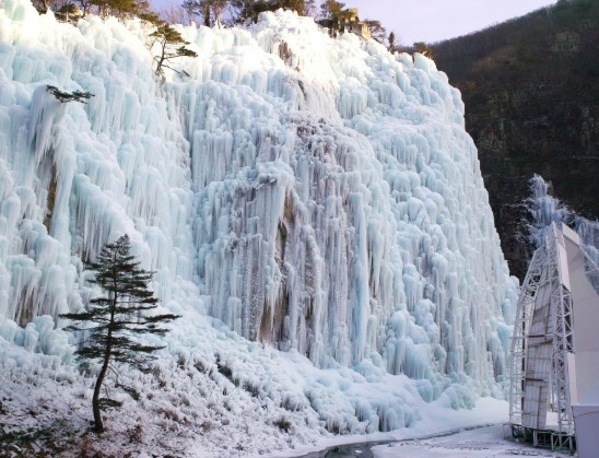 겨울에는 인공폭포에 거대한 빙벽이 형성돼 이색적인 풍경을 볼 수 있습니다. 인근 노천 온천과 함께하면 겨울 여행 만족도가 높아집니다.